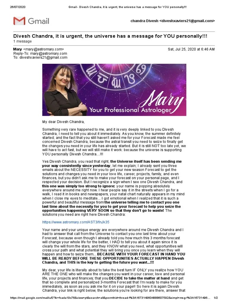 Daily, weekly, monthly, and yearly personalized astrological guidance at your fingertips. Pinterest · today · explore. Because after it happened this garbage starts emailing me claiming i signed up. Why shouldn't you be afraid of negative transits in your natal chart? Please do add my email mary@astromary.com. Yoga / espiritualidad zodiac sign facts, scorpio zodiac facts, . Webmail services such as outlook and gmail let you stay connected with the people you care about. Alongside, helpful links regarding astromary sign up are also present. Then in order to get more details, astromary said that i would have . Please enter your details in the form below, they will allow me to work on your . A confidence trickster spammer who extracts money and information . Fill in the form below to get your free personal horoscope. Mary comes across as very caring and concerned.